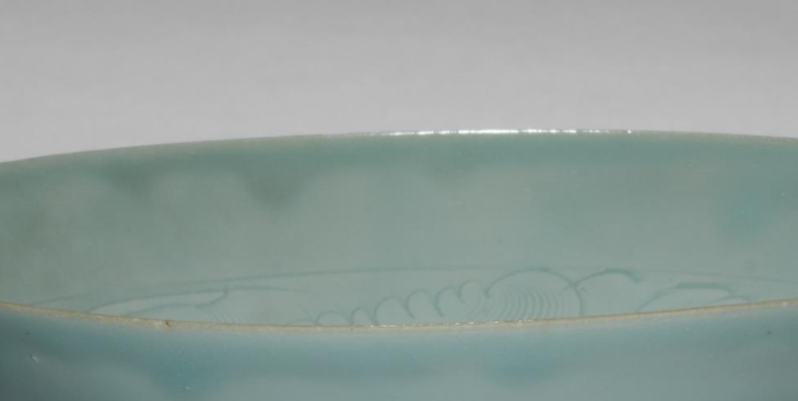本品规格为6.5 x 17.2 厘米。呈经典斗笠形,敞口、斜腹、小圈足,线条流畅自然,宛如倒置斗笠,简洁中透着端庄,契合宋代崇尚的简约美学,也适配斗茶等茶饮场景,方便观汤色、拂茶沫。施粉青釉,色泽温润如玉,柔和淡雅,尽显南宋龙泉窑粉青釉 “类玉” 的质感,釉层肥厚莹润,在光线下泛着含蓄光泽,仿佛将一汪春水凝于碗身,是龙泉窑青釉工艺巅峰的体现。内壁采用刻花工艺,隐现细腻花卉等纹样,线条婉转灵动,与素净釉面形成虚实对比,既添含蓄雅致之美,又不破坏整体简约格调,彰显宋代工匠 “以简胜繁” 的装饰智慧,借刻花传递自然意趣与生活诗意。