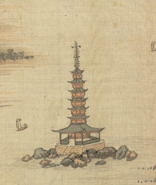 本品规格为26.4 x 28.4 厘米。画面中,碧浪湖湖面广阔,以淡墨轻染,表现出湖水的平静与开阔,寥寥几笔线条勾勒出湖面上几艘小船,增添了画面的灵动之感。湖中有一座造型古朴的塔楼,矗立在礁石之上,是画面的视觉中心。塔楼的细节描绘精致,飞檐翘角,层次分明。远处山峦之上隐约可见一些建筑,造型古朴,掩映于山林之间,暗示了此地的人文活动,增添了画面的深度和意境。