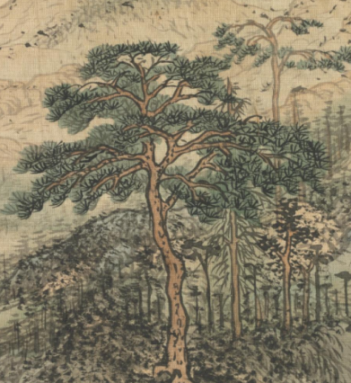 本品规格为26.4 x 28.4 厘米。山体以细腻皴法绘就,线条勾勒山石纹理,墨色浓淡表现阴阳向背,展现出洞山的古朴与厚重。山洞是画面亮点,洞内人物或坐或谈,增添人文气息,使自然山水与人文活动交融。洞山之上的松树挺拔苍劲,枝干虬曲、松针茂密,以浓墨细致描绘,是画面视觉中心,彰显生命力,也体现明代文人对松树象征意义(坚韧、高洁)的推崇 。远处山峦连绵,以淡墨轻染、简笔勾勒,与近景洞山形成虚实对比,凸显空间层次,展现湖州一带山水的悠远意境。山间树木以点染法绘出,丰富植被层次,增添自然生机。