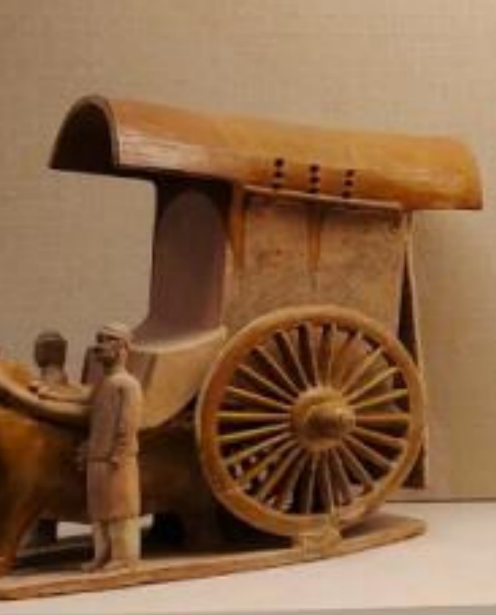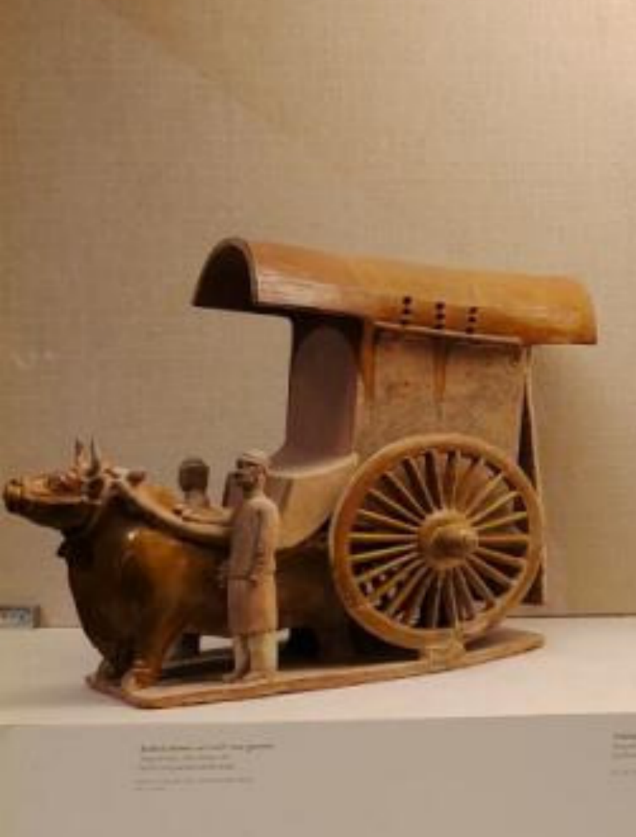 车轮细节:车轮较大,轮辐清晰可见,体现了当时车辆制造的工艺水平。车轮的边缘和辐条上或许也有一些简单的彩绘装饰,使整个牛车造型更加丰富。