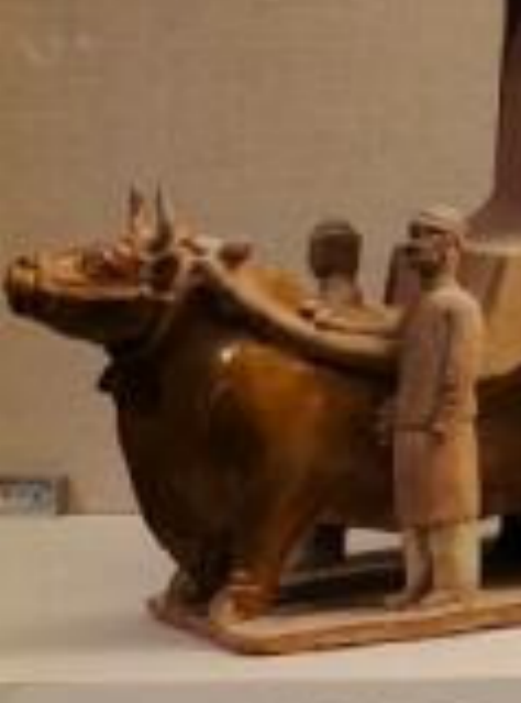 牛的塑造:拉车的牛体型健壮,头部微微抬起,双目圆睁,牛角弯曲且刻画细致,表现出牛在拉车时的用力状态。牛的身上可能有一些简单的彩绘纹饰,用来表现牛的毛发或者装饰性的披挂。