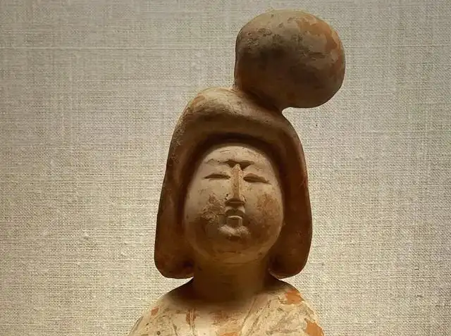 面部特征:面部圆润,符合唐代以胖为美的审美观念。眉眼细长,眼角微微上扬,透着温婉的神态;嘴巴小巧,嘴角似乎带着一丝微笑,给人亲切之感。头戴一顶较为独特的帽子,帽子顶部有一个球状装饰物,增添了几分俏皮 。