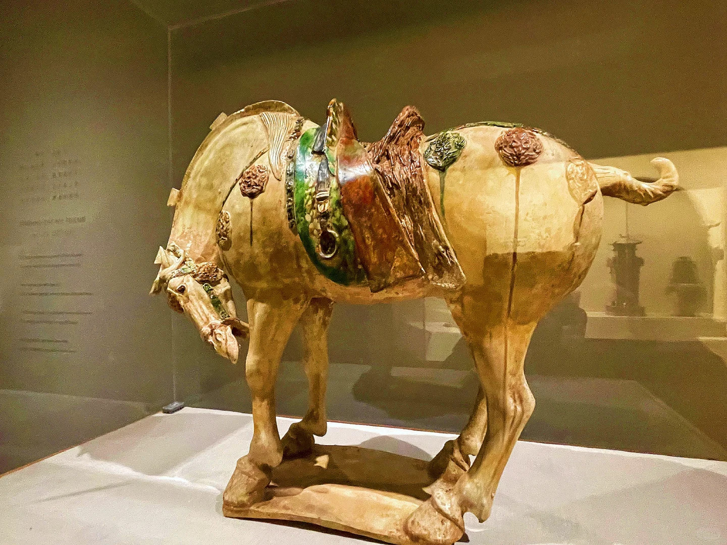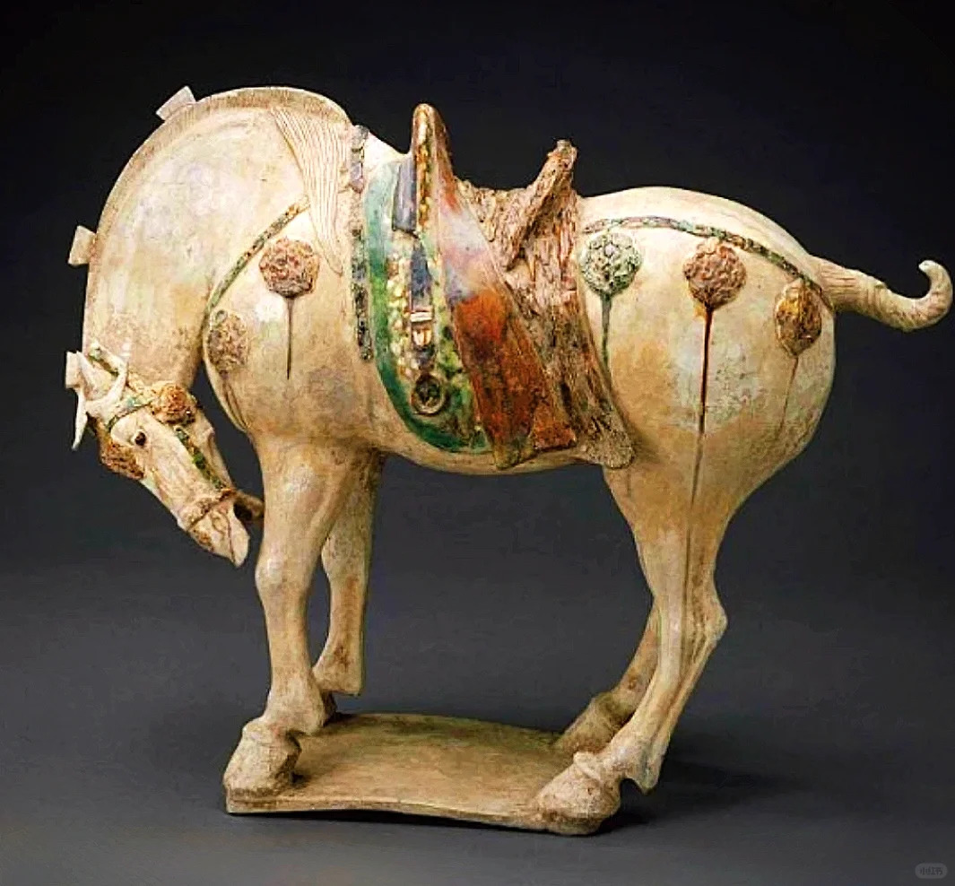装饰细节:马身施有多种颜色的釉彩,主要以黄、绿、白三色为主,色彩斑斓且过渡自然。马身上还装饰有精美的图案,如鞍鞯部分色彩丰富,绿、黄等色彩相互搭配,且上面可能饰有一些花纹图案,展现出华丽的质感。马的鬃毛刻画细致,线条流畅,通过釉彩的变化表现出鬃毛的质感。此外,马身上还点缀有一些圆形的装饰,增加了器物的美观度。虽历经岁月,部分釉彩有脱落和磨损的痕迹,但仍能看出其昔日的精美。