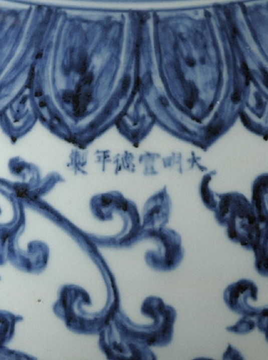 这是一个广口大罐,高度35.8厘米 宽度42.0厘米,重量为16,800g,腹部满布宝相花卷草,肩部和器体下部装饰二重莲瓣纹,颈部则环绕着卷草纹。青花发色浓艳厚重,特别是上下呼应的仰覆莲瓣纹、还有主体的宝相花纹,都赋予了这件端正厚重的大罐一种强烈的印象。研究公认官窑体制是明朝宣德年间在景德镇所确立的,自此开始的官窑产品上都有年款铭文,而这件器物上也不出例外地在肩部横书一行“大明宣德年制”。