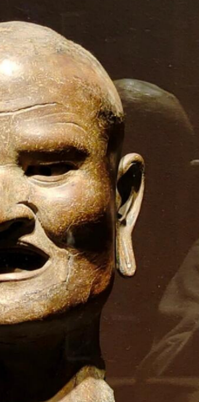 整体造型:头像为罗汉形象,头部光秃,表现出出家人的身份特征。整体造型写实,注重对人物面部神情的刻画。