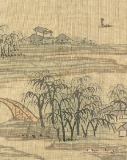 本品规格为26.4 x 28.4 厘米。画面左侧的山崖陡峭,山石以皴擦技法表现,线条粗犷有力,展现出山石的纹理和质感。中景处是错落有致的村落,房屋造型古朴,掩映在柳树等树木之间,展现出乡村生活的宁静祥和。宽阔的河流贯穿画面中部和下方,水面以淡墨轻染,表现出河水的平静。天空部分留白较多,仅以淡墨简略勾勒出几朵浮云和飞鸟,营造出开阔、宁静的氛围,与下方的景物形成动静对比。