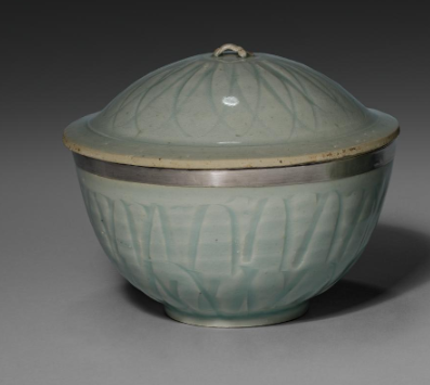 本品规格为12.5 x 15.5 厘米。为盖碗(含碗身、 盖 ), 碗身圆腹、 圈足, 盖作穹顶形(顶置环形钮 ), 整体线条圆润, 符合南宋 “简约优雅” 的器型审美 —— 实用(便于盛物、 取盖 )又具观赏性。 碗身、 盖面以阴刻莲瓣纹装饰(线条流畅, 花瓣层次清晰 ), 借 “莲” 寓意 “清廉、 纯净”(南宋文人崇尚的品格 ), 也契合 “莲纹” 在陶瓷装饰中的吉祥传统。碗口沿镶银扣(银质包边 ), 既加固口沿(防磕碰 ), 又添 “银白” 与 “青釉” 的色彩对比, 是南宋 “镶口” 工艺(贵族器物常用金银铜镶口, 显身份 )的体现。
