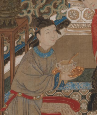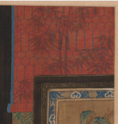 本品规格为96.5 x 44.1 厘米。画中两位古装人物,红衣仕女身姿优雅,旁有侍女奉茶,服饰、姿态尽显古典韵味。背景有山水屏风、花卉、精致家具,色彩古朴和谐,通过对环境、人物的细致刻画,呈现清代贵族仕女闲适生活片段,反映当时审美与生活风貌,是研究清代绘画、社会生活的生动素材 。