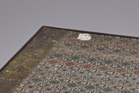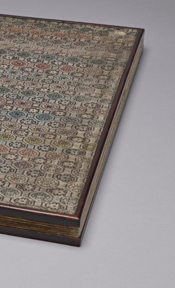 本品规格为44 x 35 厘米。方形盒体,规整厚重,天地盖结构,边框深色木质,沉稳古朴,与顶面彩锦形成 “硬软材质对比”。顶面以几何纹彩锦覆盖,由圆形、 菱形等图案重复排列,红、 蓝、 绿、 黄等色交织,虽历经岁月,仍显色彩层次与织锦细腻,是清代织锦工艺(或缂丝、 妆花缎 )的体现,暗合 “天圆地方” 传统审美。