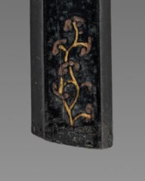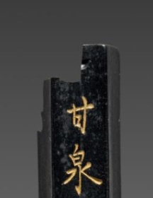 本品规格为9.3 厘米。呈长条状,墨体以黑色为主,古朴厚重。一侧有残缺,显岁月痕迹,增添历史沧桑感 。墨身正面以金色楷书刻 “甘泉瑞草” 四字,字体规整,笔力遒劲,在黑墨映衬下,金黄醒目,尽显典雅。文字下方饰瑞草图案,线条细腻,以棕褐等色呈现,与墨色、金色搭配和谐,寓意吉祥,呼应 “瑞草” 主题 。