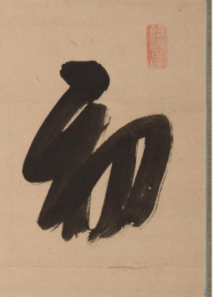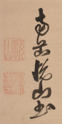 本品规格为28.6 x 64.1 厘米。以米色(或浅褐色)为底,装裱有古朴的绫边。字体为草书,笔画连绵、笔势灵动,墨色浓淡变化自然,呈现出洒脱不羁的艺术风格。布局上,字与字、行与行之间呼应连贯,“初” 字造型独特、笔力雄健,尤为醒目。钤有红色印章,增添古朴韵味,整体展现清代草书的豪放气势与艺术魅力。