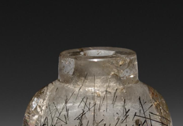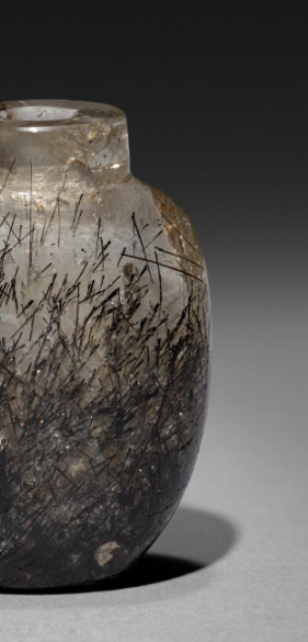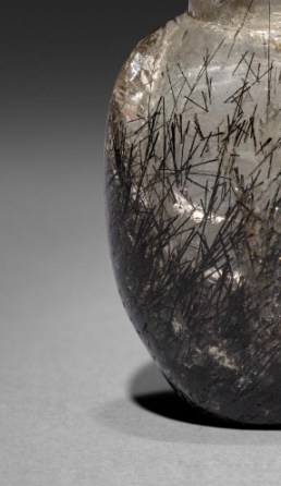 本品规格为5.8 厘米。以发晶为材质,呈椭圆瓶状,小口、短颈、鼓腹。透明晶体中,黑色发丝状矿物(多为金红石等)自然分布,如草随风动,天然成景。发晶珍贵,鼻烟壶在清代兼具实用(盛鼻烟 )与赏玩价值,此壶展现清代对天然材质的巧借与工艺,是研究清代鼻烟壶文化、水晶工艺的实物,具艺术与收藏意义 。