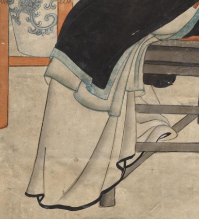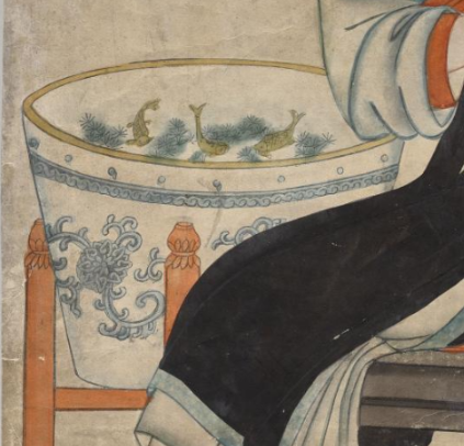本品规格为73.2 x 45.7 厘米。仕女形象: 着清代典型服饰 —— 上袄下裙, 外搭黑色长背心(比甲 ), 衣饰配色清雅(白、 蓝、 黑、 红点缀 ); 发髻精致, 插饰小巧, 耳戴金环, 面容端庄, 手持团扇, 闲坐椅上, 传递 “闺阁闲适” 的气韵 。闺阁陈设: 以瓷缸(绘游鱼、 蓝花纹 )、 素椅为配景, 瓷缸造型古朴, 游鱼灵动, 与仕女、 团扇搭配, 营造出 “静雅又含生机” 的闺阁氛围; 团扇绘兰草, 呼应文人雅趣, 拓展画面文化层次 。