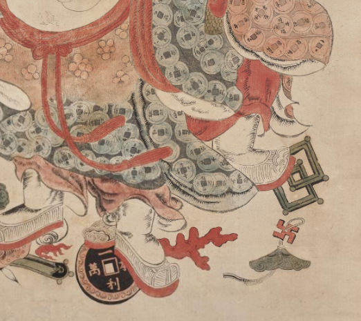 二人面相圆润、 笑容可掬, 着宽袖长袍(蓝灰、 粉褐两色, 饰铜钱纹 ), 形态亲昵(相拥、 同坐 ), 典型 “和合二仙” 造型 —— 象征 “夫妻和睦、 家庭团圆”, 左侧持宝盒、 右侧捧莲花, 暗合 “和谐、 多子” 寓意 。 脚下有 “磬”(谐音 “庆” )、 珊瑚、 方胜(古 “八宝” 元素 ), 宝盒绘红黑花纹, 莲花枝叶舒展, 强化 “祈福纳祥(吉祥、 富贵、 多福 )” 主题, 是清代民俗画 “以物载意” 的体现 。