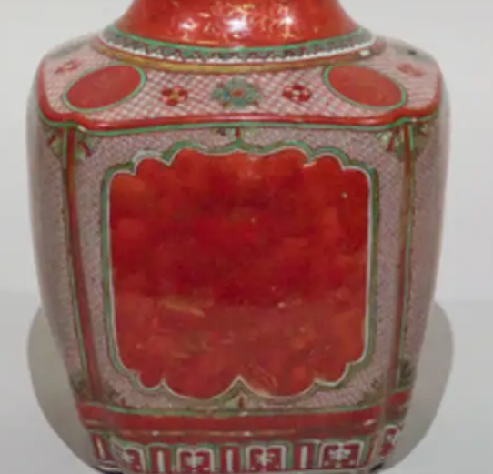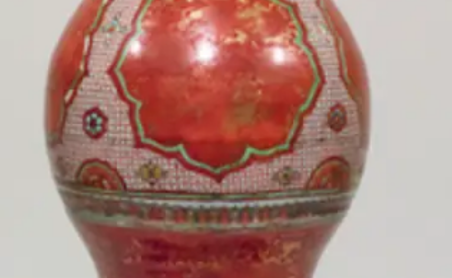 五彩金襕手瓢形大瓶是明代景德镇的瓷器,具有五彩瓷器的特点,红地上附加花草纹描金,底部有富贵佳器的青花四字铭文。在未烧成的泥胚上用青花料绘制蓝色图案,罩上透明釉后入窑经1300度左右高温烧成瓷器,然后在釉面上用红、绿、黄、紫等釉上彩颜料绘制,最后再入炉火经800度低温二次烧制而成