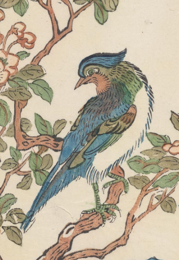 本品规格为53 x 34.6 厘米。 禽鸟主体为蓝绿羽色, 头部蓝冠醒目, 羽翼层次分明(蓝羽渐变、 胸腹白羽 ), 栖于花枝, 神态悠然, 似专注观瞧下方; 花枝绽粉白小花, 绿叶点缀, 枝干赭褐, 线条流畅, 呈现 “花繁鸟静” 的生机 。花猫伏于石旁, 黑、 白、 黄毛色相间, 昂首盯向禽鸟, 神态灵动(耳竖、 目睁 ), 传递 “欲戏还观” 的俏皮, 与禽鸟形成 “静动呼应” 。