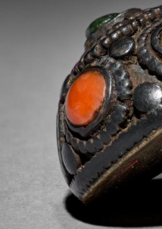 本品规格为6.4 厘米。整体呈蘑菇状 。其主体由银打造,经过岁月洗礼,表面呈现出深沉古朴的色泽,带有一层自然的包浆。鼻烟壶盖的顶部是装饰重点,镶嵌着多颗色彩艳丽的宝石,包括明艳的红色(可能是珊瑚 )、翠绿的宝石,以及其他色泽的宝石 。这些宝石被精心排布,周围辅以金属錾刻的精美花纹,凸显出宝石的璀璨,展现出繁复华丽的装饰风格。鼻烟壶盖下端连接着木质部件,可能是为了更好地适配鼻烟壶口,起到密封作用, 同时也为这件精美的配件增添了一丝质朴之感。历经时光流转,木质部分略显陈旧,带有自然的磨损痕迹。