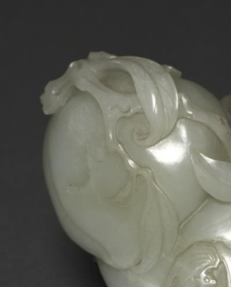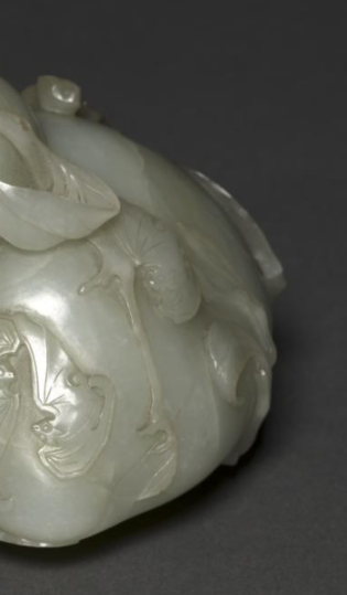 本品规格为9.9 x 13.5 x 11.5 厘米。以温润青玉雕琢。呈瓜果造型,浮雕蝙蝠、寿桃、枝叶,“蝠” 谐 “福”,“桃” 寓 “寿”,是传统吉祥纹饰。工艺细腻,线条流畅,玉质莹润,兼具把玩与祈福意,尽显清代玉雕工艺与民俗文化,为文玩佳器,映当时审美与生活情致 。