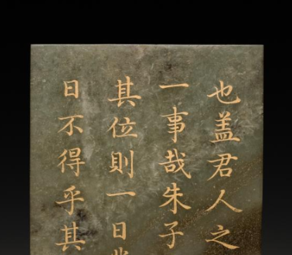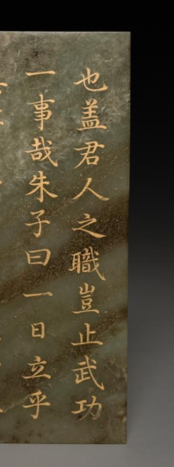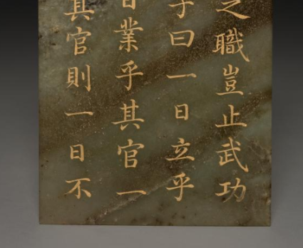 本品规格为18.5 厘米。以青玉为质地,色泽呈温润的青绿色,表面有自然纹理。牌体为长方形,规整简洁。其上以金粉书写铭文,字体古朴,内容为 “也盖君人之职岂止武功一事哉朱子曰一日立乎其位则一日业乎其官一日不得乎其官则一日不” ,体现儒家思想与为君为官理念,金书工艺精湛,文字与青玉相衬,兼具文化内涵与艺术价值,是研究清代玉器工艺、思想文化的实物 。
