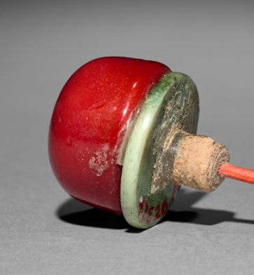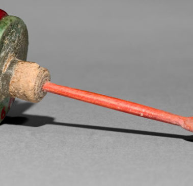 清代,鼻烟是颇为流行的嗜好品, 而鼻烟容易受外界湿气、灰尘影响而变质。这件鼻烟壶塞能紧密塞住鼻烟壶口,形成良好的密封效果,有效防止鼻烟受潮、串味, 最大程度保留鼻烟的香气与品质。鼻烟壶塞下端的细长木质勺,方便使用者从鼻烟壶中舀取适量鼻烟。这种设计不仅便捷,还避免了直接用手接触鼻烟, 符合当时较为讲究的卫生观念和优雅的生活方式。