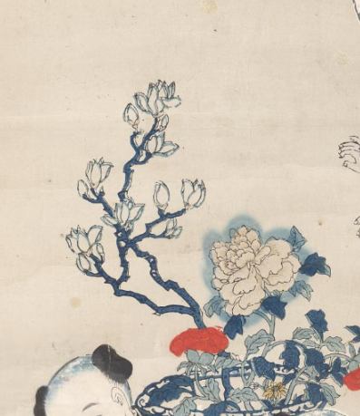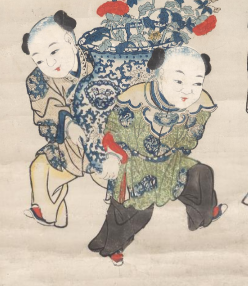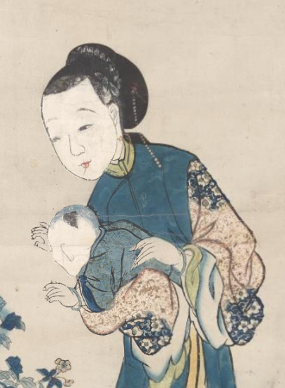 在清代,女性的主要活动空间是闺阁, 她们承担着相夫教子等家庭职责。 闺阁文化强调女性的品德修养、 才艺技能,如女红、诗词等。 同时,女性在家庭的祭祀、 祈福等活动中也扮演着重要角色。 图中仕女携童赏花,可能是参与家庭祈福活动的场景, 展现了女性在家庭文化生活中的作用, 也体现了闺阁文化中对美好、 雅致生活的追求。