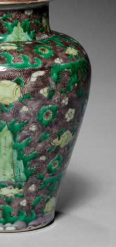 本品规格为36.8 x 23.8 厘米。为将军罐(直口、 短颈、 丰肩、 鼓腹、 圈足 ), 配覆钵式盖(盖顶塑宝珠钮 ), 整体器型挺拔端庄(肩宽腹圆, 比例协调 ), 符合清代 “陈设瓷” 追求的 “大气威严” 审美。绘海兽纹(如海马、 瑞兽 )、 海浪纹(仿海水波涛, 线条卷曲灵动 )、 山石花卉(象征 “福山寿海” ), 浮雕纹样层次丰富(海兽似从海浪中 “浮出”, 山石花卉穿插其间 ), 布局繁密有序(颈部、 肩部、 腹部、 足部各有纹饰带, 却不显杂乱 )。