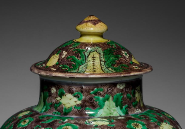 由于其造型端庄大气, 纹饰精美华丽, 清代素三彩海兽纹盖罐常被摆放在客厅、书房、 卧室等室内空间作为陈设品。在博古架、案几上摆放这样的瓷罐, 可以成为室内的视觉焦点, 为家居环境增添艺术氛围, 彰显主人的高雅品味和身份地位 。无论是在宫廷王府, 还是在富贵人家, 它都能起到美化环境、 提升格调的作用。