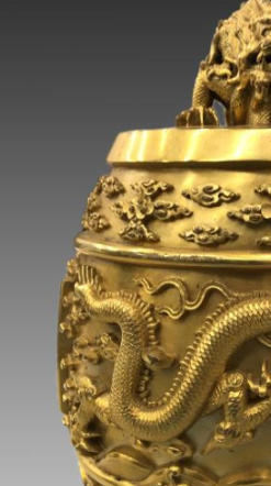 本品高度为22厘米,直径18.1厘米。钟体呈桶状,上窄下宽,线条敦实厚重。顶部铸龙形钮,龙首威严, 龙身盘踞,生动立体,似欲腾空, 与钟体 “云龙” 主题呼应,强化皇权象征 。钟身满布浮雕云龙纹, 巨龙穿梭于祥云间,龙鳞细密、龙爪刚劲, 祥云层次丰富,环绕龙身, 底部饰圆形纹(似乳钉或海水纹变体 ), 整体纹饰布局规整, 龙纹矫健威严,尽显清代皇家器物 “龙纹” 霸气, 传达 “皇权天授” 与祥瑞之意 。