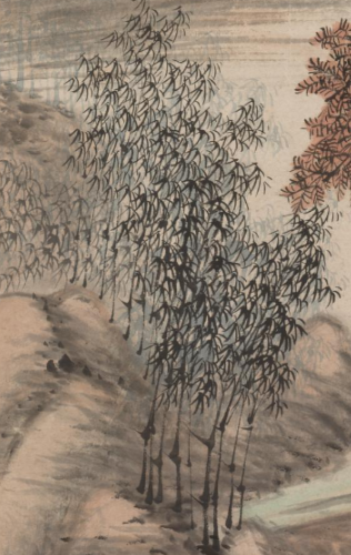 本品规格为146 x 58 厘米。采用高远与平远结合的构图,远景山峦层叠,以淡墨轻染勾勒轮廓,近景、中景布置红树、溪流、竹丛等,层次分明,营造出深远空间感 。以白(浅)色为底,山峦施淡赭、灰褐等柔和色调,树叶染以鲜明的红(偏赭红 )色,对比中见和谐,凸显秋日氛围 。山峦用披麻皴等技法,笔触细腻,体现山石纹理;树木勾勒枝干后点染树叶,笔法简洁;墨色浓淡相宜,展现清代文人画的笔墨韵味 。