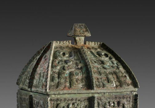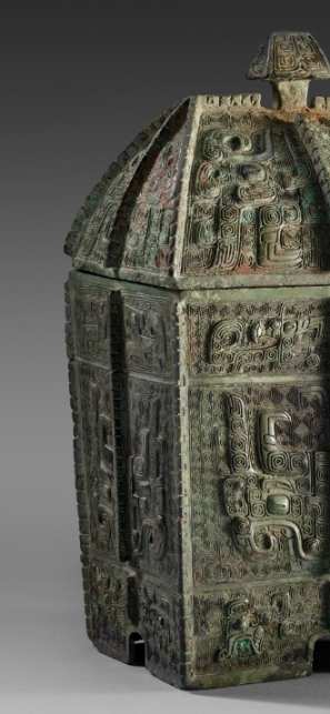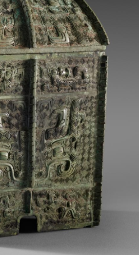 本品规格为22.8 厘米。整体呈方箱状,带穹顶形盖,盖顶有捉手。方正器身与坡顶盖结合, 既具稳定感,又似微缩建筑,体现商代对 “天圆地方” 等观念的映射,庄重肃穆 。满布兽面纹(饕餮纹 ),辅以云雷纹等。兽面纹以浮雕呈现,双眼突出、线条蜿蜒, 神秘威严,是商代青铜礼器典型纹饰, 承载祭祀、威慑等功能,彰显神性与王权 。