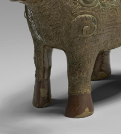 本品规格为22厘米。以羊为原型塑造,四足稳健站立,羊首昂起,呈现出一种庄重、古朴的姿态。羊角弯曲盘旋,纹理清晰且富有层次感,表面经岁月侵蚀形成斑驳锈迹,却更添历史厚重感。羊身满布商代典型的兽面纹、云雷纹等,线条流畅又不失古朴稚拙,纹样相互交织。