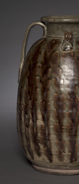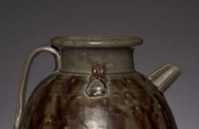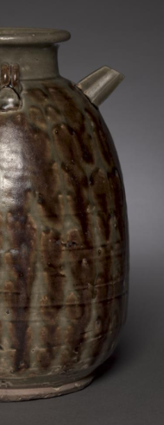 本品规格为29.2 x 19.8 厘米,直径10.3厘米。造型规整,为典型唐代执壶样式。盘口、短颈,溜肩鼓腹,下腹渐收,饼形足。一侧设曲柄,连接口沿与腹部;另一侧置短流,便于倾倒液体。通体施青釉,釉面点缀褐彩条纹,自然流淌,形成独特纹理,富有艺术韵味。腹部有双系,可穿绳辅助提携,兼具实用与装饰性。整体古朴典雅,体现唐代制瓷工艺,反映当时茶文化、生活用器风貌,是唐代陶瓷艺术的生动体现 。