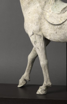 本品规格为78.1 x 80 x 22.2 厘米。骏马呈行走姿态,四足动态自然(左前足微抬,余足沉稳踏地 ),肌肉线条流畅(胸肌、 腿部肌肉隆起 ),完美复刻唐代战马 “矫健雄劲” 的体态,体现唐人对马的观察入微与塑马技艺的高超。马背置鞍鞯(马鞍及障泥 ),鞍桥高翘,鞍面弧度贴合马背,细节刻画精准(如鞍鞯边缘的褶皱 ),既显实用功能,又添艺术美感,是唐代 “鞍马俑” 塑造鞍具的典型风格。