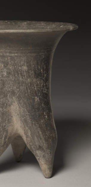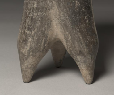 本品规格为22.9 x 17 厘米。整体呈古朴的灰黑色。器型特征鲜明,上部为侈口,口沿外敞;颈部收束,线条利落;袋足饱满,呈中空状,三足分立支撑器身,造型独特且富有张力。