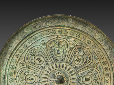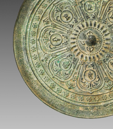 本品直径为22.3厘米,高度1.5厘米。呈圆形,中心有镜钮。镜面以莲花为主要装饰元素,花瓣形分区内铸刻梵文,边缘饰连珠纹等小花饰,整体布局规整。铜质表面因岁月氧化呈青绿色,尽显古朴厚重。它将宗教梵文与莲花纹饰融合,既具照容实用功能,又承载元代宗教文化、工艺审美。
