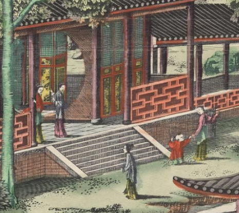 本品规格为120.6 x 67.3 厘米。远景以山峦为幕, 主峰巍峨,云雾轻绕, 山下河湖开阔, 勾勒出 “近景庭院、中景山水、远景层峦” 的空间层次, 营造出开阔悠远的意境 。中景、近景聚焦中式庭院, 楼阁错落 —— 歇山顶、飞檐翘角, 红柱、绿栏、雕花门窗, 呈现典型清代建筑风格, 布局规整, 展现 “深宅大院” 的庄重与精致 。