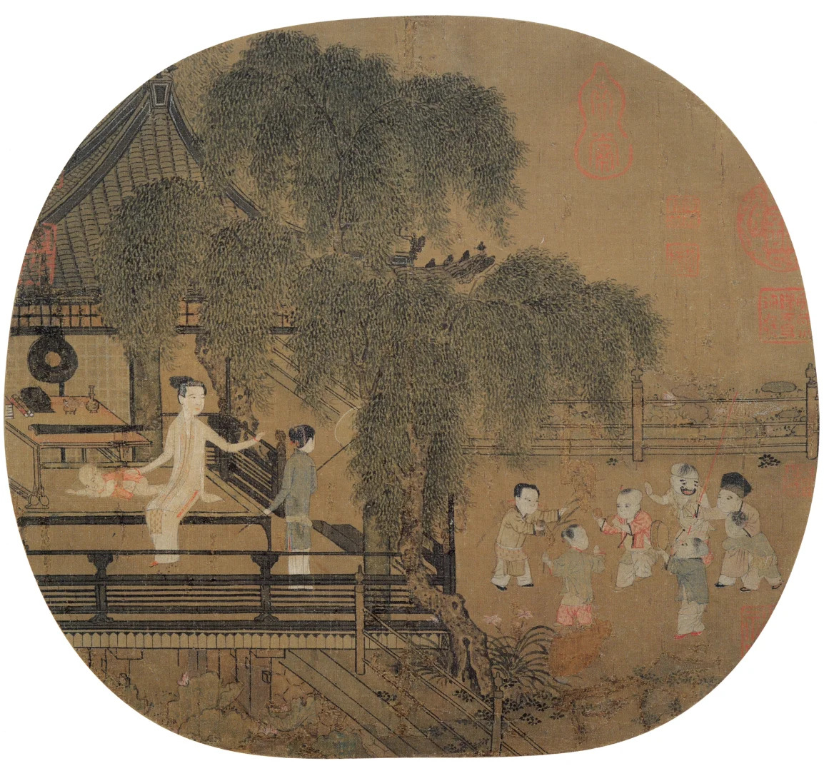 画面构图:采用圆形构图,画面布局精巧。画面一侧是一座古朴的亭阁,亭阁内设有桌椅,桌上摆放器物,展现出当时的生活场景。亭阁周围垂柳依依,柳枝随风摇曳,增添了画面的生动感与层次感。画面另一侧是一群嬉戏玩耍的婴孩,他们姿态各异,动作活泼,充满童趣。
