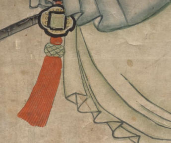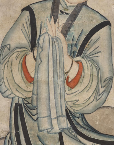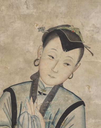 本品规格为74.6 x 45.8 厘米。仕女身着清代典型服饰 —— 浅蓝大襟长衫, 黑边勾勒衣襟、 袖口, 衬以朱红里料, 色彩素雅又不失细节; 下着长裙, 腰侧垂红穗配饰, 增添灵动; 发型为清代女性常见样式, 发髻简约, 插饰小簪, 耳戴环形耳饰, 尽显温婉 。双手合十, 轻握绢帕, 姿态端庄, 似礼佛或祈福; 面容清秀, 眉眼平和, 传递出含蓄、 娴静的气质, 契合清代对女性 “温婉恭谨” 的审美 。