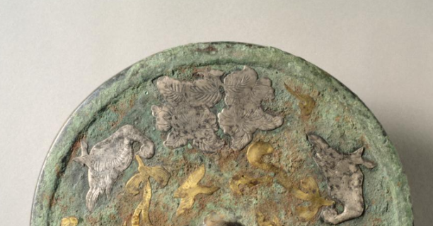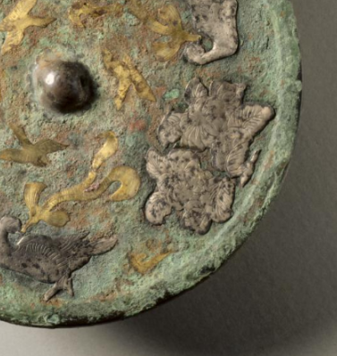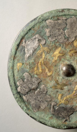 本品规格为直径16.8厘米,高度0.9厘米。铜镜以青铜铸就,轮廓规整,线条流畅, 圆形的外观符合唐代铜镜常见的造型,体现了唐代器物造型简洁大气的风格。镜背是纹饰的主要展示区域,装饰极为精美。 银质的花朵栩栩如生,花瓣纹理清晰,有的花朵层层叠叠, 尽显雍容华贵之态,可能是象征富贵的牡丹等花卉; 禽鸟造型生动,或展翅欲飞,或静立休憩,姿态各异, 展现出灵动之美。金质的流云穿插其间,线条婉转流畅, 为整个画面增添了飘逸之感。花鸟与流云相互映衬, 构成一幅富有生机与活力的画面, 体现了唐代人对自然的喜爱和对美好生活的向往。