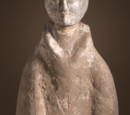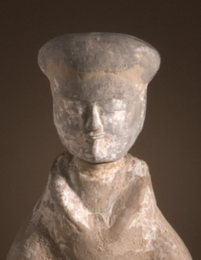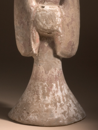 本品规格为头部12.7*13.34*11.43厘米,主体72.07 x 27.94 x 14.61 厘米,整体74.93 x 27.94 x 14.61 厘米。双手拢于袖中,作持物或侍奉状,姿态端庄恭谨;面部五官虽经岁月侵蚀仍可辨大致轮廓,眉眼、口鼻线条简练,传递出沉静、肃穆的神态,契合 “侍俑” 身份属性。 为典型汉代侍俑造型,呈站立姿态,比例修长,展现出汉代陶俑古朴简约的风格。人物头戴帽饰,面部轮廓简洁,身着宽袖长袍,衣摆垂坠感明显,下摆呈喇叭状展开,体现汉代服饰特征。