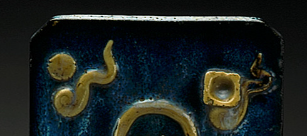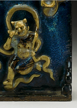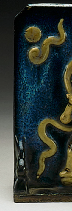 本品规格为19.05 x 14.61 x 5.4 厘米。以珐华工艺制作,蓝釉为地,釉面流淌自然,呈现出如星空般的深邃质感;黄釉堆塑人物、云纹等装饰,立体感极强堆塑人物形象生动,头戴环形冠饰,身绕飘带,搭配云纹、方孔钱币等元素,传递 “祈福纳祥、辟邪趋吉” 的民俗寓意。