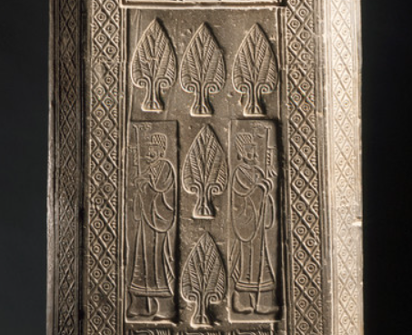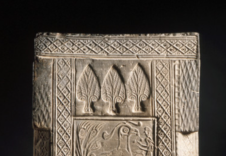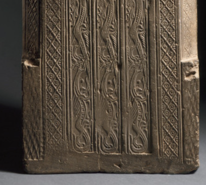 本品规格为81.3 x 25.4 x 12.7 厘米。以陶为材质,呈长条形。表面浮雕工艺精湛,纹饰分区域布局:顶部饰规整树形纹,中间有禽鸟与人物互动场景,下方是人物、树形纹组合,底部为卷曲纹样,边缘配几何纹。整体构图严谨,雕刻细腻。