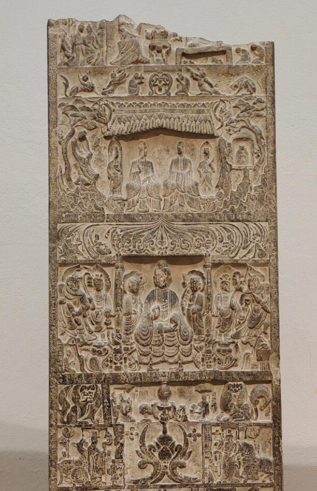 中层:可能是佛教故事场景的雕刻,人物众多,形态各异。有的人物在虔诚礼拜,有的在听佛讲经,通过不同的姿态和表情,生动地展现出佛教故事的情节。雕刻线条细腻,人物的服饰、发饰等细节都刻画得较为清晰。