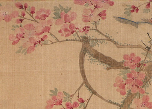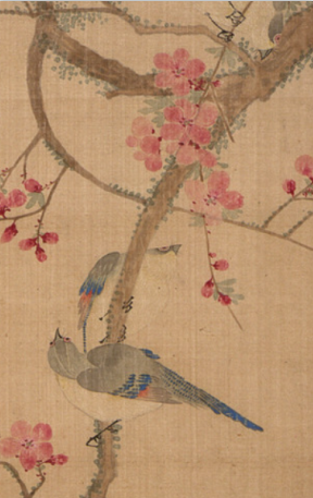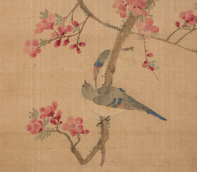 本品规格为29.21 x 23.81 厘米,安装38.74 x 58.1 厘米。以细腻工笔绘春日桃枝,粉花绽满枝头, 花瓣轻盈,花蕊点缀,鲜活生动;几只禽鸟栖息、嬉戏,羽毛以灰、蓝、白等色细致描绘, 形态各异,或静立、或顾盼,尽显灵动之姿。桃枝曲折伸展,疏密得当, 留白背景简洁,突出花鸟主体。粉花与禽鸟相映成趣, 传递出春日生机与闲适意趣,是马元驭对自然生机与文人雅趣的融合呈现, 展现清代花鸟画的细腻与鲜活。