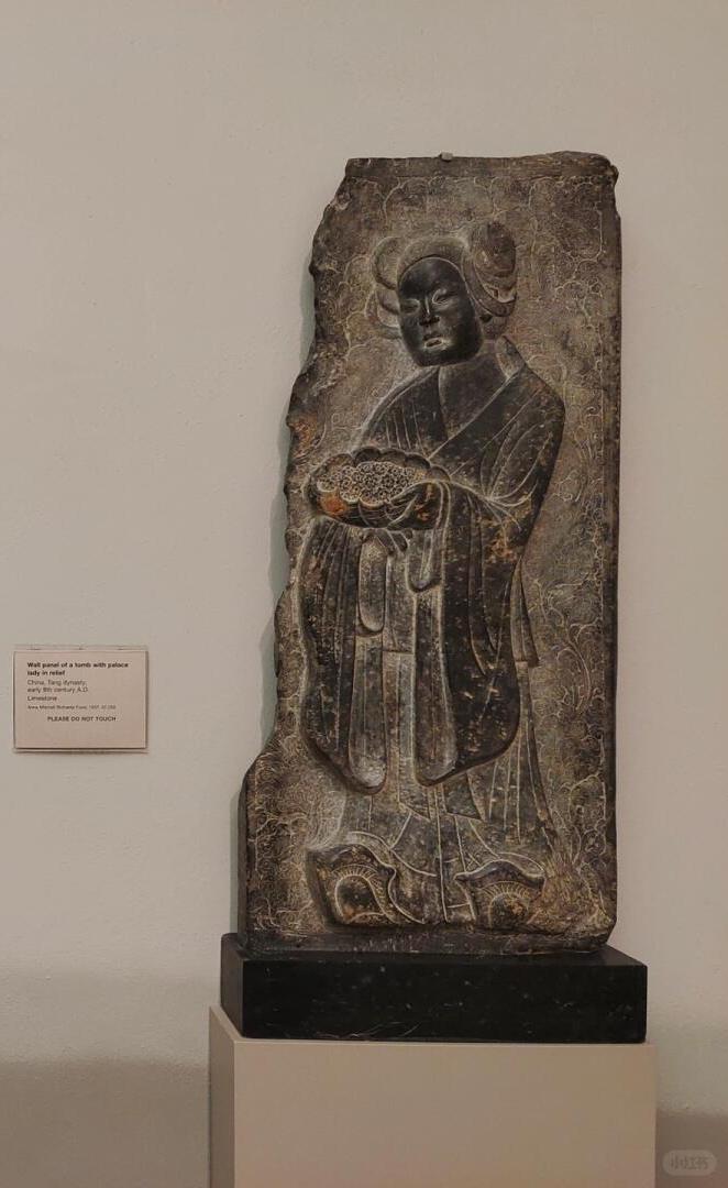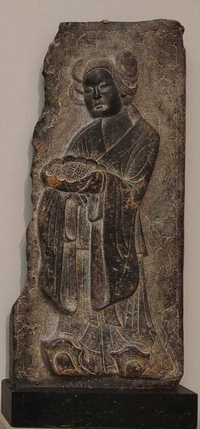 在丧葬文化方面,唐代贵族阶层十分重视墓葬的营造,往往会在墓葬中放置大量精美的随葬品,包括陶俑、金银器、玉器以及雕刻精美的浮雕等,以彰显身份地位和对死后生活的期许。这些仕女浮雕便是唐代贵族墓葬装饰的一部分,不仅反映了当时高超的雕刻艺术水平,也为我们了解唐代贵族女性的服饰、生活方式、审美情趣以及社会地位等方面提供了珍贵的实物资料。