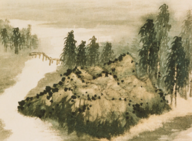 本品规格为27.94 x 22.22 厘米,安装33.97*26.67厘米,垫子40.6*35.6厘米。以淡墨轻染绘就山水意境。画面中,汀洲居于河道间,草木、杂树点缀其上,朦胧中见生机。远处林木、小桥隐于雾气,添悠远之韵。左下角,头戴斗笠的人影立于草间,似赏景、似沉吟,尽显闲适。