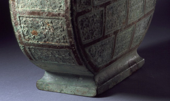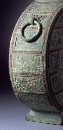 本品规格为31.12 x 31.12 厘米。属 “扁壶” 形制,横宽竖窄,颈短口小,圆腹方足(圈足为方形 ),便于 “随身携行”(战国战争频繁,扁壶可束于车马、腰间,盛酒浆 ),是战国实用青铜器的典型造型(适应军事、出行需求 )。腹部两侧设 “衔环耳”—— 环耳套于兽首(或简化龙形 )耳座,环可活动,既具装饰性(打破扁壶单调感 ),又有实用功能(穿绳提携 ),体现 “造型 - 功能” 的统一 。