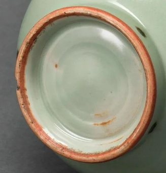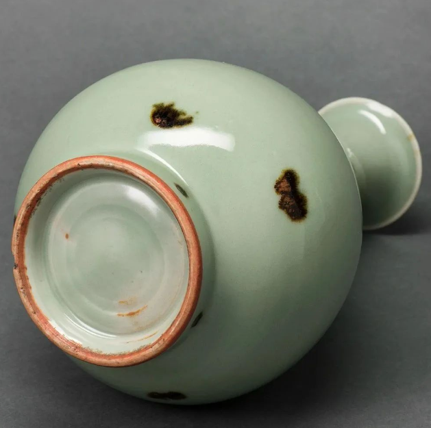 元龙泉窑青釉褐彩玉壶春瓶高27.4cm、整体比例协调,体现元代器物端庄稳重的风格。胎质呈灰白色,胎体轻薄或浑厚凝重(因具体器物用途而异),圈足足端露胎处多呈火石红色,通体施青釉,釉色莹润如玉石,常见粉青、梅子青等色调,釉面匀净,玉质感强烈;以紫金土为原料在釉面进行点染,经高温烧制后形成不规则褐斑,部分褐斑自然晕散,如“一抹华云”,部分则呈铁锈色斑点,与青釉形成鲜明对比。日本学界将此类器物称为“飞青瓷”,意为褐斑如“飞花入浩”般灵动