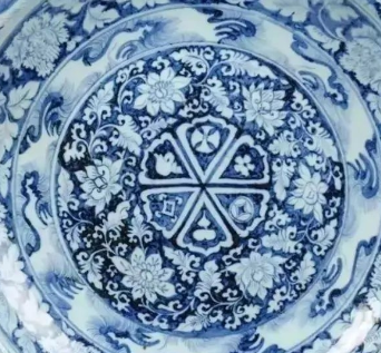 青花宝相花卷草纹盘以宝相花和卷草纹为核心装饰元素。宝相花作为佛教文化影响下的经典纹样,常以多层花瓣叠压、对称放射的形态呈现,象征庄严圣洁;卷草纹则以连续缠绕的曲线构成,寓意生生不息,两者结合形成繁而不乱的视觉效果