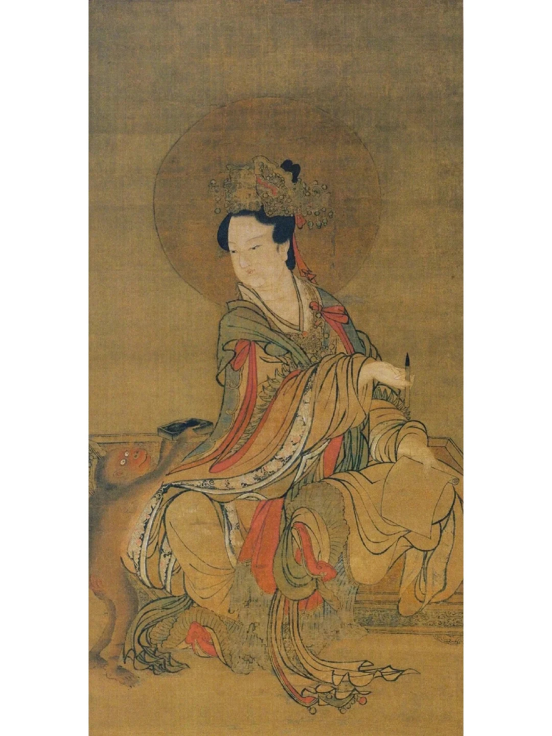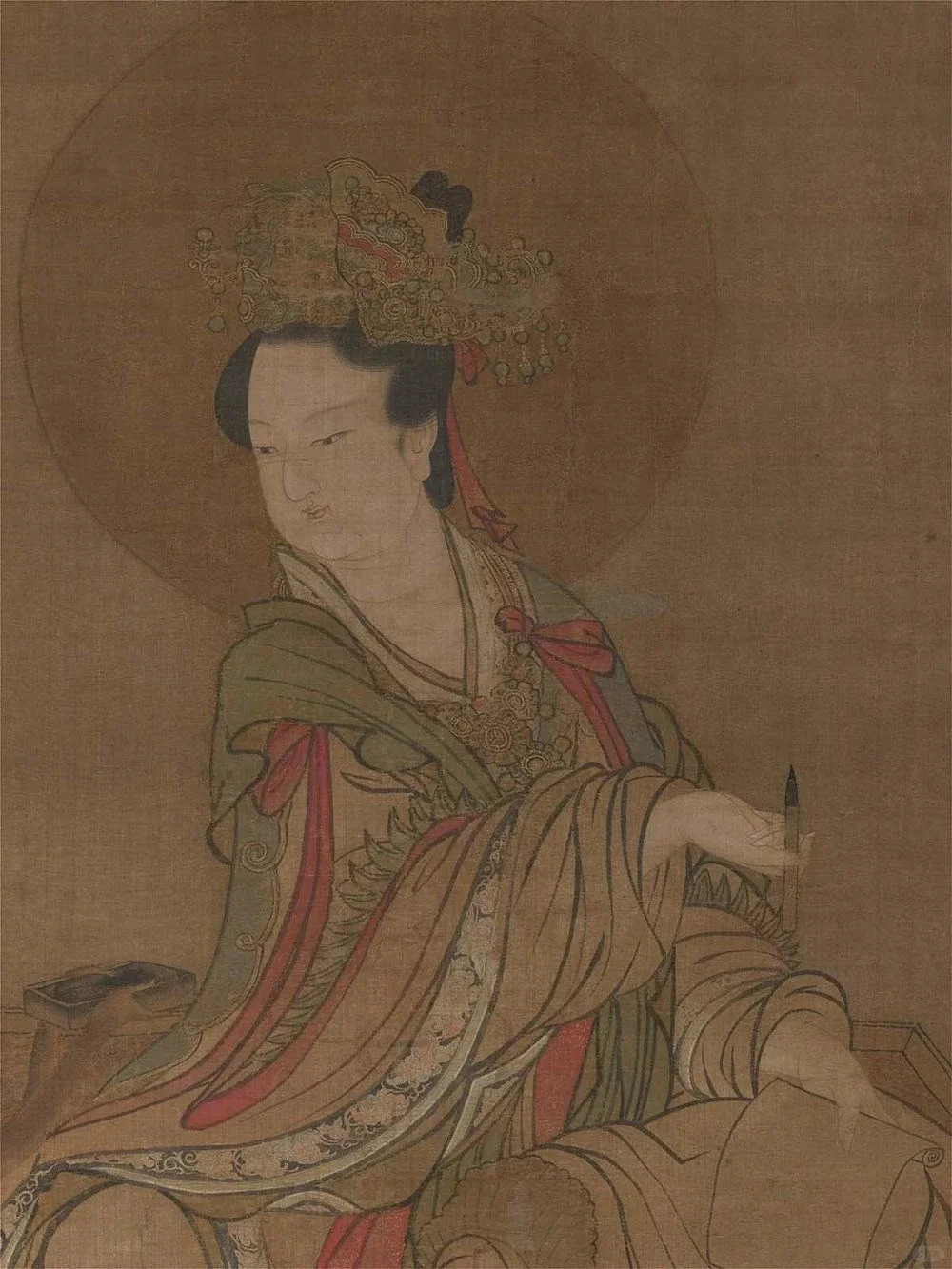 人物刻画:画面主体是一位端庄优雅的女性形象,即水星神。她头戴华丽的冠饰,冠饰上装饰有珠宝、花朵等元素,尽显华贵。面容丰腴圆润,眉眼细长,双目微微低垂,神态宁静而温婉,透露出一种超凡脱俗的气质。身着宽大且色彩绚丽的长袍,衣纹线条流畅自然,通过细腻的笔触和丰富的色彩变化,生动地表现出丝绸般的质感和衣物的垂坠感。长袍上还装饰有精美的花纹图案,增添了华丽感。她右手持笔,左手放在腿上,姿态优雅,似乎在进行书写或思考。